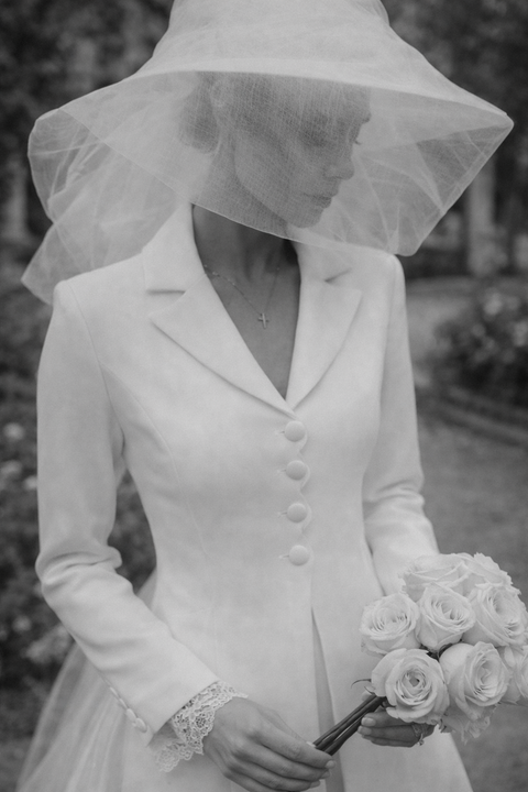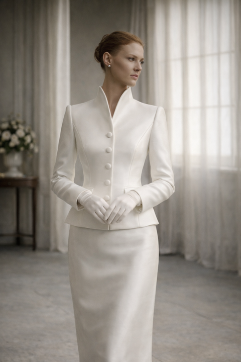 Whether you envision a structured coat dress, a fluid silk gown, or a modern tailored bridal piece, each design is developed exclusively for you.